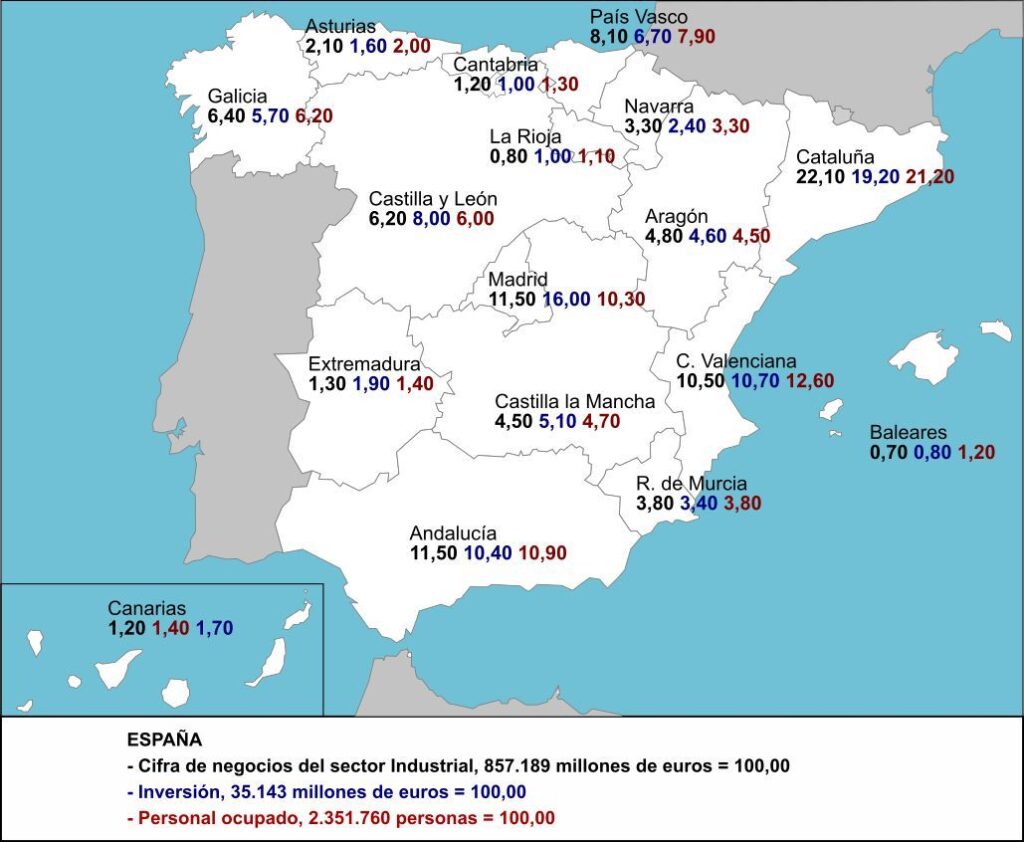 El mapa recoge la información publicada por el INE en la Estadística estructural de empresas del sector Industrial, lo que nos permite conocer en porcentajes sobre el total nacional, tanto la cifra de negocios (en negrita), de la inversión material (en azul) y del total de personas ocupadas (en rojo), por Comunidades y Ciudades autónomas y a nivel nacional.